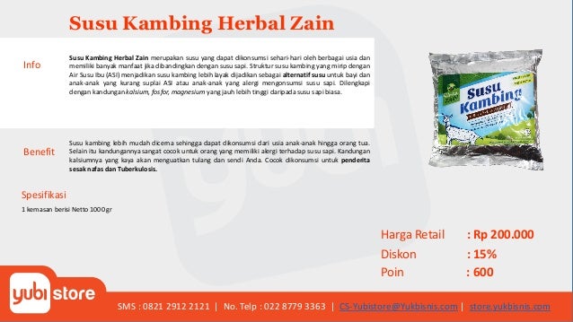 - 10. Susu Kambing Herbal Zain Benefit Susu kambing lebih mudah dicerna sehingga dapat dikonsumsi dari usia bawah umur hingga anak Adam tua. Selain itu kandungannya banyak sesuai buat anak Adam yang ada alergi terhadap buah dada sapi. Kandungan kalsiumnya yang kaya akan menguatkan tulang dengan sendi Anda. Cocok dikonsumsi buat penderita sesak nafas dengan Tuberkulosis. Info Susu Kambing Herbal Zain melahirkan buah dada yang dapat dikonsumsi sehari-hari akibat berbagai usia dan memiliki banyak manfaat jika dibandingkan dengan buah dada sapi. Struktur buah dada kambing yang imbas-imbas dengan Air Susu Ibu (ASI) menjadikan buah dada kambing lebih cukup dijadikan sebagai alternatif buah dada buat budak dan anak-anak yang minim suplai ASI alias bawah umur yang alergi melahap buah dada sapi. Dilengkapi dengan diktum kalsium, fosfor, magnesium yang asing lebih tinggi dari buah dada jawi biasa. Spesifikasi 1 kemasan berisi Netto 1000 gr SMS : 0821 2912 2121 | No. Telp : 022 8779 3363 | CS-Yubistore@Yukbisnis.com | store.yukbisnis.com Harga Retail : Rp 200.000 Diskon : 15% Poin : 600