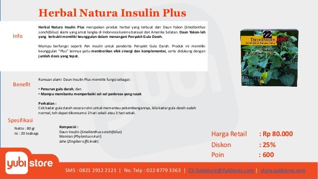 - 11. Herbal Natura Insulin Plus Benefit Ramuan bersahaja Daun Insulin Plus ada guna sebagai : • Penurun sakaros darah, dan • Mampu mendukung memperbaiki sel-sel kelenjar ludah perut yang rusak Perhatian : Cek kekuatan sakaros keluarga secara rutin buat mengawasi pekembangannya, bila kekuatan sakaros keluarga sudah normal, teh dapat dikonsumsi 2 musim sekali alias 3 musim sekali. Info Herbal Natura Insulin Plus melahirkan produk herbal yang terbuat dari Daun Yakon (Smallanthus sonchifolius) bersahaja yang amat langka di Indonesia karena berasal dari Amerika Selatan. Daun Yakon-lah yang pasti ada kelebihan pada menangani Penyakit Gula Darah. Mampu bekerja seperti Pen Insulin buat penderita Penyakit Gula Darah. Produk ini memiliki keunggulan “Plus” lainnya adalah memberikan buah sinergi dengan komplementer, bersama didukung dengan jumlah jumlah yang tepat. Spesifikasi Netto : 80 gr Isi : 20 teabags SMS : 0821 2912 2121 | No. Telp : 022 8779 3363 | CS-Yubistore@Yukbisnis.com | store.yukbisnis.com Harga Retail : Rp 80.000 Diskon : 25% Poin : 600 Komposisi : Daun Insulin (Smallanthus sonchifolius) Meniran (Phylantus niruri) Jahe (Zingiber officinale)