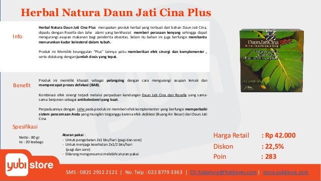 - 12. Herbal Natura Daun Jati Cina Plus Benefit Produk ini ada khasiat sebagai pelangsing dengan aturan meluak asupan lemak dan mempercepat cara defekasi (BAB). Kombinasi buah sinergi terjadi melalui perpaduan diktum Daun Jati Cina dengan Rosella yang sama- sama berperan sebagai antikolesterol yang kuat. Perpaduannya dengan Jahe pada produk ini melepaskan buah komplementer yang bekerja memperbaiki sistem penghancuran Anda yang mungkin terganggu karena buah defekasi (Buang Air Besar) dari Daun Jati Cina Info Herbal Natura Daun Jati Cina Plus melahirkan produk herbal yang terbuat dari bahan Daun Jati Cina, dipadu dengan Rosella dengan Jahe bersahaja yang berfaedah melepaskan perasaan bosan sehingga dapat mengurangi asupan makanan alokasi penderita obesitas. Selain itu bahan ini juga bekerja membantu menurunkan kekuatan kolesterol pada tubuh. Produk ini Memiliki kelebihan “Plus” lainnya adalah memberikan buah sinergi dengan komplementer , serta didukung dengan kuantitas jumlah yang tepat. Spesifikasi Netto : 80 gr Isi : 20 teabags SMS : 0821 2912 2121 | No. Telp : 022 8779 3363 | CS-Yubistore@Yukbisnis.com | store.yukbisnis.com Aturan memakai : - Untuk pengobatan 2x1 bks/hari (pagi dengan sore) - Untuk menjaga kesegaran 2x1/2 bks/hari (pagi dengan sore) - Dilarang melahap melebihi adat pakai Harga Retail : Rp 42.000 Diskon : 22,5% Poin : 283