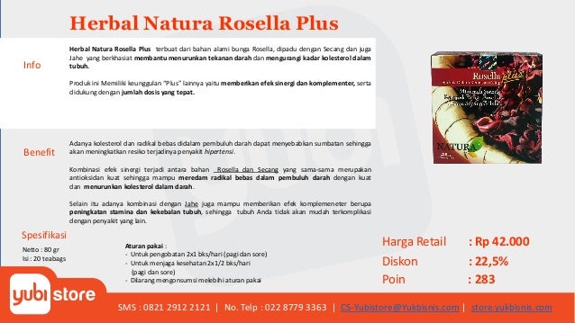 - 13. Herbal Natura Rosella Plus Benefit Adanya kolesterol dengan pelampau bebas didalam pembuluh keluarga dapat menyebabkan sumbatan sehingga akan meningkatkan resiko kejadian penyakit hipertensi. Kombinasi buah sinergi terjadi antara bahan Rosella dengan Secang yang saling merupakan antioksidan awet sehingga becus meredam pelampau bebas pada pembuluh keluarga dengan kuat dan menurunkan kolesterol pada darah. Selain itu adanya kombinasi dengan Jahe juga becus memberikan buah komplemeneter berupa peningkatan stamina dengan kekuatan tubuh, sehingga tubuh Anda tak akan mudah terkomplikasi dengan penyakit yang lain. Info Herbal Natura Rosella Plus terbuat dari bahan bersahaja bunga Rosella, dipadu dengan Secang dengan juga Jahe yang berfaedah mendukung menurunkan apitan keluarga dengan meluak kekuatan kolesterol dalam tubuh. Produk ini Memiliki kelebihan “Plus” lainnya adalah memberikan buah sinergi dengan komplementer, serta didukung dengan kuantitas jumlah yang tepat. Spesifikasi Netto : 80 gr Isi : 20 teabags SMS : 0821 2912 2121 | No. Telp : 022 8779 3363 | CS-Yubistore@Yukbisnis.com | store.yukbisnis.com Aturan memakai : - Untuk pengobatan 2x1 bks/hari (pagi dengan sore) - Untuk menjaga kesegaran 2x1/2 bks/hari (pagi dengan sore) - Dilarang melahap melebihi adat pakai Harga Retail : Rp 42.000 Diskon : 22,5% Poin : 283