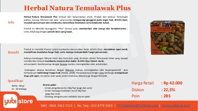 - 14. Herbal Natura Temulawak Plus Benefit Produk ini ada khasiat buat mendukung menurunkan kekuatan Artritis Gout, meredakan nyeri sendi, memelihara kesegaran guna hati, bersama becus memperbaiki guna penghancuran . Adanya diktum Minyak Atsiri dengan Kurkumin yang berpengaruh pada Temulawak inilah yang banyak memberikan khasiat mendukung menurunkan kekuatan Artritis Gout pada darah. am penyakit. Kombinasinya dengan Secang becus meningkatkan buah antioksidan. Sedangkan adanya kombinasi dengan Meniran becus meningkatkan buah hepatoprotektif atau kemampuan melindungi guna hati (Harish, 2006). Perpaduannya dengan Jahe bekerja memperkuat daya anti nyeri, pertama nyeri pada sendi-sendi alias dikenal juga dengan Rematik. Info Herbal Natura Temulawak Plus terbuat dari bahan-bahan alami. Produk dari paduan Temulawak pilihan, Secang, Meniran dengan Jahe yang becus meluak godaan pada alat hati, Artritis Gout, masalah penghancuran dengan mendukung melantan kesegaran bersama kekuatan tubuh. Produk ini Memiliki kelebihan “Plus” lainnya adalah memberikan buah sinergi dengan komplementer , serta didukung dengan kuantitas jumlah yang tepat. Spesifikasi Netto : 80 gr Isi : 20 teabags SMS : 0821 2912 2121 | No. Telp : 022 8779 3363 | CS-Yubistore@Yukbisnis.com | store.yukbisnis.com Harga Retail : Rp 42.000 Diskon : 22,5% Poin : 283 Aturan memakai : - Untuk pengobatan 2x1 bks/hari (pagi dengan sore) - Untuk menjaga kesegaran 2x1/2 bks/hari (pagi dengan sore) - Dilarang melahap melebihi adat pakai