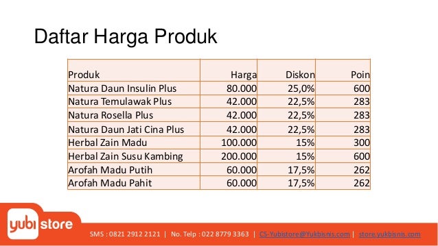 - 16. Daftar Harga Produk Produk Harga Diskon Poin Natura Daun Insulin Plus 80.000 25,0% 600 Natura Temulawak Plus 42.000 22,5% 283 Natura Rosella Plus 42.000 22,5% 283 Natura Daun Jati Cina Plus 42.000 22,5% 283 Herbal Zain Madu 100.000 15% 300 Herbal Zain Susu Kambing 200.000 15% 600 Arofah Madu Putih 60.000 17,5% 262 Arofah Madu Pahit 60.000 17,5% 262 SMS : 0821 2912 2121 | No. Telp : 022 8779 3363 | CS-Yubistore@Yukbisnis.com | store.yukbisnis.com