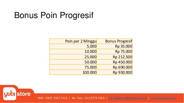 - 17. Bonus Poin Progresif Poin bohlam 2 Minggu Bonus Progresif 5.000 Rp 35.000 10.000 Rp 75.000 25.000 Rp 212.500 50.000 Rp 450.000 75.000 Rp 690.000 100.000 Rp 930.000 SMS : 0821 2912 2121 | No. Telp : 022 8779 3363 | CS-Yubistore@Yukbisnis.com | store.yukbisnis.com