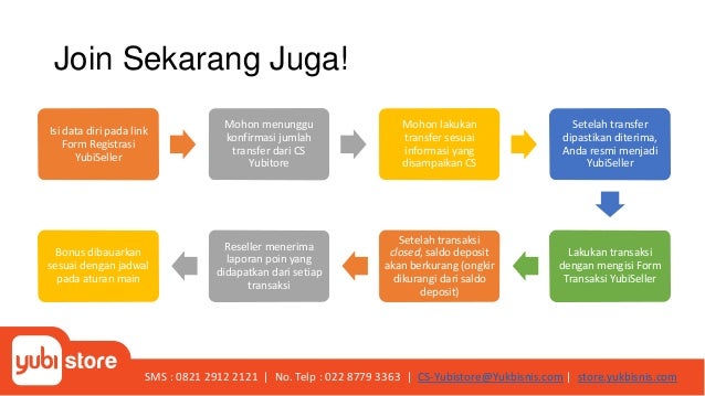 - 18. Join Sekarang Juga! Isi data diri pada link Form Registrasi YubiSeller Mohon menunggu konfirmasi jumlah transfer dari CS Yubitore Mohon lakukan transfer sesuai informasi yang disampaikan CS Setelah transfer dipastikan diterima, Anda resmi menjadi YubiSeller Lakukan transaksi dengan memadatkan Form Transaksi YubiSeller Setelah transaksi closed, saldo deposit akan berkurang (ongkir dikurangi dari saldo deposit) Reseller menerima laporan dot yang didapatkan dari setiap transaksi Bonus dibauarkan sesuai dengan jadwal pada adat main SMS : 0821 2912 2121 | No. Telp : 022 8779 3363 | CS-Yubistore@Yukbisnis.com | store.yukbisnis.com