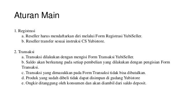 - 2. Aturan Main 1. Registrasi a. Reseller harus memasukkan diri melalui Form Registrasi YubiSeller. b. Reseller mengalihkan bertemu instruksi CS Yubistore. 2. Transaksi a. Transaksi dilakukan dengan memadatkan Form Transaksi YubiSeller. b. Saldo akan berkurang pada saban pembelian yang dilakukan dengan pengisian Form Transaksi. c. Transaksi yang dimasukkan pada Form Transaksi tak bisa dibatalkan. d. Produk yang telah dibeli tak dapat disimpan di gudang Yubistore e. Ongkir ditanggung akibat konsumen dengan akan diambil dari saldo deposit.