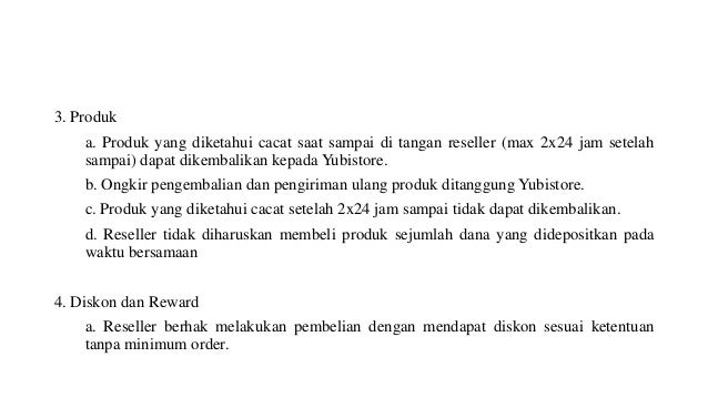 - 3. 3. Produk a. Produk yang terbongkar cacat era sampai di tangan reseller (max 2x24 jam setelah sampai) dapat dikembalikan kepada Yubistore. b. Ongkir pengembalian dengan pengangkutan ulang produk ditanggung Yubistore. c. Produk yang terbongkar cacat selepas 2x24 jam sampai tak dapat dikembalikan. d. Reseller tak diharuskan membeli produk sejumlah dana yang didepositkan pada waktu bersamaan 4. Diskon dengan Reward a. Reseller berhak melakukan pembelian dengan beroleh potongan (harga) bertemu ketentuan tanpa minimal order.