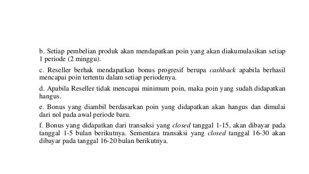 - 4. b. Setiap pembelian produk akan membaca dot yang akan diakumulasikan setiap 1 ambang (2 minggu). c. Reseller berhak membaca bonus maju berupa cashback andaikata berhasil mencapai dot tertentu pada saban periodenya. d. Apabila Reseller tak mengaras minimal poin, maka dot yang telah didapatkan hangus. e. Bonus yang diambil berdasarkan dot yang didapatkan akan hangus dengan dimulai dari nol pada awal ambang baru. f. Bonus yang didapatkan dari negosiasi yang closed tanggal 1-15, akan dibayar pada tanggal 1-5 bulan berikutnya. Sementara negosiasi yang closed tanggal 16-30 akan dibayar pada tanggal 16-20 bulan berikutnya.