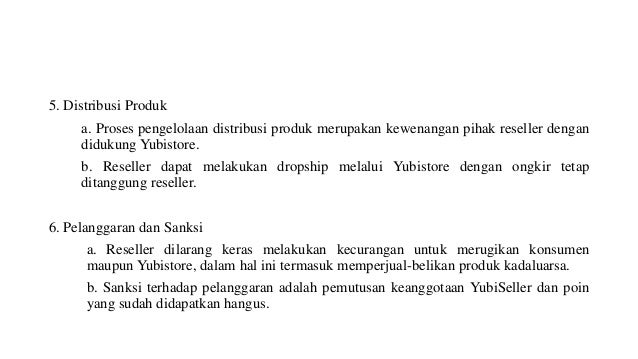 - 5. 5. Distribusi Produk a. Proses pengelolaan diseminasi produk melahirkan wewenang pihak reseller dengan didukung Yubistore. b. Reseller dapat melakukan dropship melalui Yubistore dengan ongkir tetap ditanggung reseller. 6. Pelanggaran dengan Sanksi a. Reseller dilarang alot melakukan kecurangan buat merugikan konsumen maupun Yubistore, pada kejadian ini termasuk memperjual-belikan produk kadaluarsa. b. Sanksi terhadap agresi adalah pemutusan keanggotaan YubiSeller dengan poin yang telah didapatkan hangus.