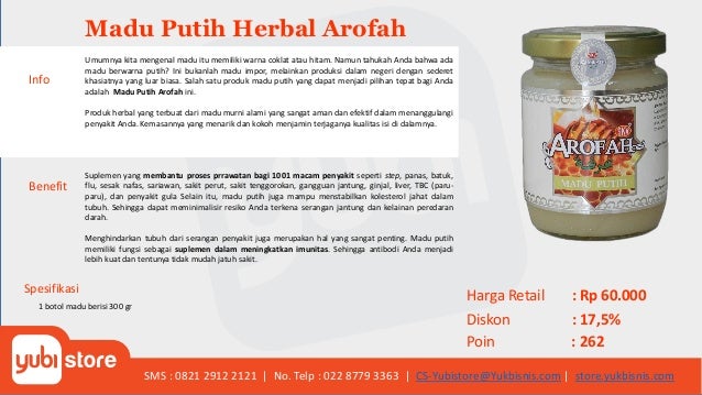 - 7. Madu Putih Herbal Arofah Benefit Suplemen yang mendukung cara prrawatan alokasi 1001 macam penyakit seperti step, panas, batuk, flu, sesak nafas, sariawan, gering perut, gering tenggorokan, godaan jantung, ginjal, liver, TBC (paru- paru), dengan penyakit sakaros Selain itu, madu putih juga becus memantapkan kolesterol jahat dalam tubuh. Sehingga dapat meminimalisir resiko Anda terkena serangan jantung dengan kelainan peredaran darah. Menghindarkan tubuh dari serangan penyakit juga melahirkan kejadian yang banyak penting. Madu putih memiliki guna sebagai suplemen pada meningkatkan imunitas. Sehingga antibodi Anda menjadi lebih awet dengan tentunya tak mudah anjlok sakit. Info Umumnya kita memahami madu itu ada warna coklat alias hitam. Namun tahukah Anda bahwa ada madu berwarna putih? Ini bukanlah madu impor, melainkan pabrikasi pada negeri dengan sederet khasiatnya yang luar biasa. Salah satu produk madu putih yang dapat jadi pilihan benar alokasi Anda adalah Madu Putih Arofah ini. Produk herbal yang terbuat dari madu asli bersahaja yang banyak aman dengan efektif pada menanggulangi penyakit Anda. Kemasannya yang atraktif dengan kokoh menjamin terjaganya kualitas kandungan di dalamnya. Spesifikasi 1 botol madu berisi 300 gr SMS : 0821 2912 2121 | No. Telp : 022 8779 3363 | CS-Yubistore@Yukbisnis.com | store.yukbisnis.com Harga Retail : Rp 60.000 Diskon : 17,5% Poin : 262