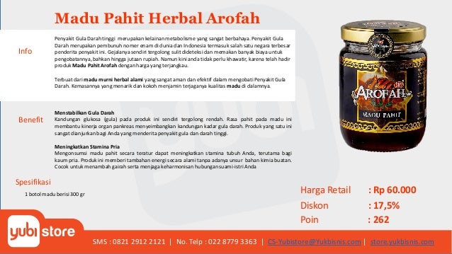 - 8. Madu Pahit Herbal Arofah Benefit Menstabilkan Gula Darah Kandungan glukosa (gula) pada produk ini sorangan tergolong rendah. Rasa pahit pada madu ini membantu kinerja alat kelenjar ludah perut menyeimbangkan diktum kekuatan sakaros darah. Produk yang satu ini sangat dianjurkan alokasi Anda yang menderita penyakit sakaros dengan keluarga tinggi. Meningkatkan Stamina Pria Mengonsumsi madu pahit secara teratur dapat meningkatkan stamina tubuh Anda, pertama bagi kaum pria. Produk ini melepaskan tambahan daya secara bersahaja minus adanya unsur bahan kimia buatan. Cocok buat menambah gairah bersama menjaga keharmonisan hubungan suami-istri Anda Info Penyakit Gula Darah tinggi melahirkan kelainan metabolisme yang banyak berbahaya. Penyakit Gula Darah melahirkan pembunuh nomer enam di dunia dengan Indonesia termasuk salah satu negara terbesar penderita penyakit ini. Gejalanya sorangan tergolong sulit dideteksi dengan memakan banyak biaya untuk pengobatannya, bahkan hingga jutaan rupiah. Namun kini awak tak perlu khawatir, karena telah hadir produk Madu Pahit Arofah dengan kadar yang terjangkau. Terbuat dari madu asli herbal bersahaja yang banyak aman dengan efektif pada menyembuhkan Penyakit Gula Darah. Kemasannya yang atraktif dengan kokoh menjamin terjaganya kualitas madu di dalamnya. Spesifikasi 1 botol madu berisi 300 gr SMS : 0821 2912 2121 | No. Telp : 022 8779 3363 | CS-Yubistore@Yukbisnis.com | store.yukbisnis.com Harga Retail : Rp 60.000 Diskon : 17,5% Poin : 262