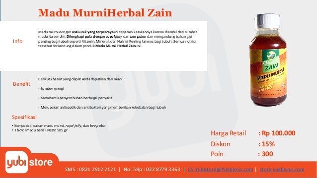 - 9. Madu MurniHerbal Zain Benefit Berikut khasiat yang dapat Anda dapatkan dari madu : - Sumber energi - Membantu penyembuhan berbagai penyakit - Merupakan antiseptik dengan antibakteri yang memberikan kekuatan alokasi tubuh Info Madu asli dengan asal-usul yang terpercaya ini terjamin keasliannya karena diambil dari sumber madu itu sendiri. Dilengkapi kembali dengan royal jelly dengan bee polen dengan mengandung bahan gizi penting alokasi tubuh seperti Vitamin, Mineral, dengan Nutrisi Penting lainnya alokasi tubuh. Semua nutrisi tersebut terkandung pada produk Madu Murni Herbal Zain ini. Spesifikasi • Komposisi : cairan madu murni, royal jelly, dengan bee polen • 1 botol madu berisi Netto 585 gr SMS : 0821 2912 2121 | No. Telp : 022 8779 3363 | CS-Yubistore@Yukbisnis.com | store.yukbisnis.com Harga Retail : Rp 100.000 Diskon : 15% Poin : 300